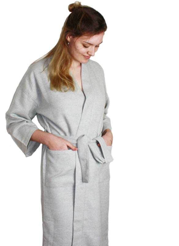 Deze fijne dunne badjas valt een stuk over de knie en is ideaal bij warmer weer thuis of in de sauna en spa. De badjas heeft lange mouwen, een ceintuur en 2 diepe zakken