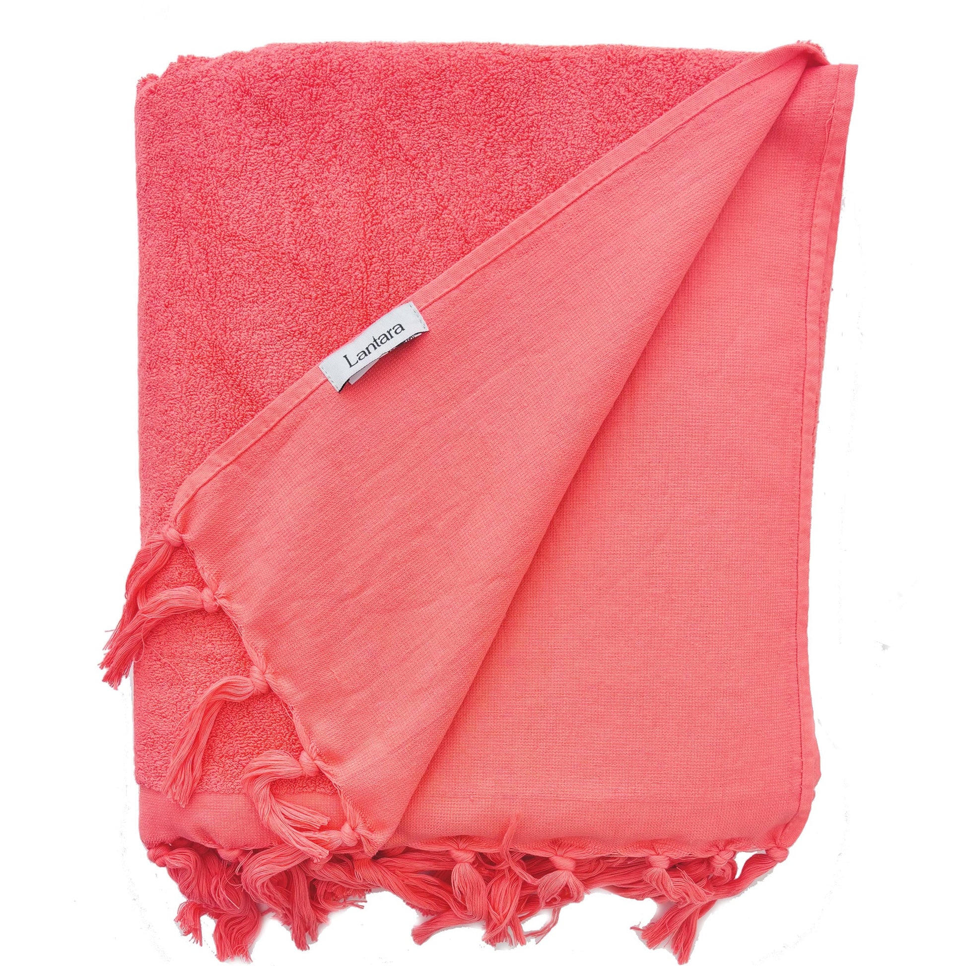 Een heerlijk zachte Oranje Roze (Coral) hamamdoek met badstof aan één kant. De hamamdoek of badlaken is met zijn afmeting van bijna 1 bij 2 meter zeer royaal van formaat! Hoewel zwaarder dan de lichtgewicht hamamdoek, blijft dit strandlaken een heel groot licht badlaken. De doek is in één stuk geweven en daarmee nog steeds lichter dan een gewoon badlaken. Handig voor onderweg.