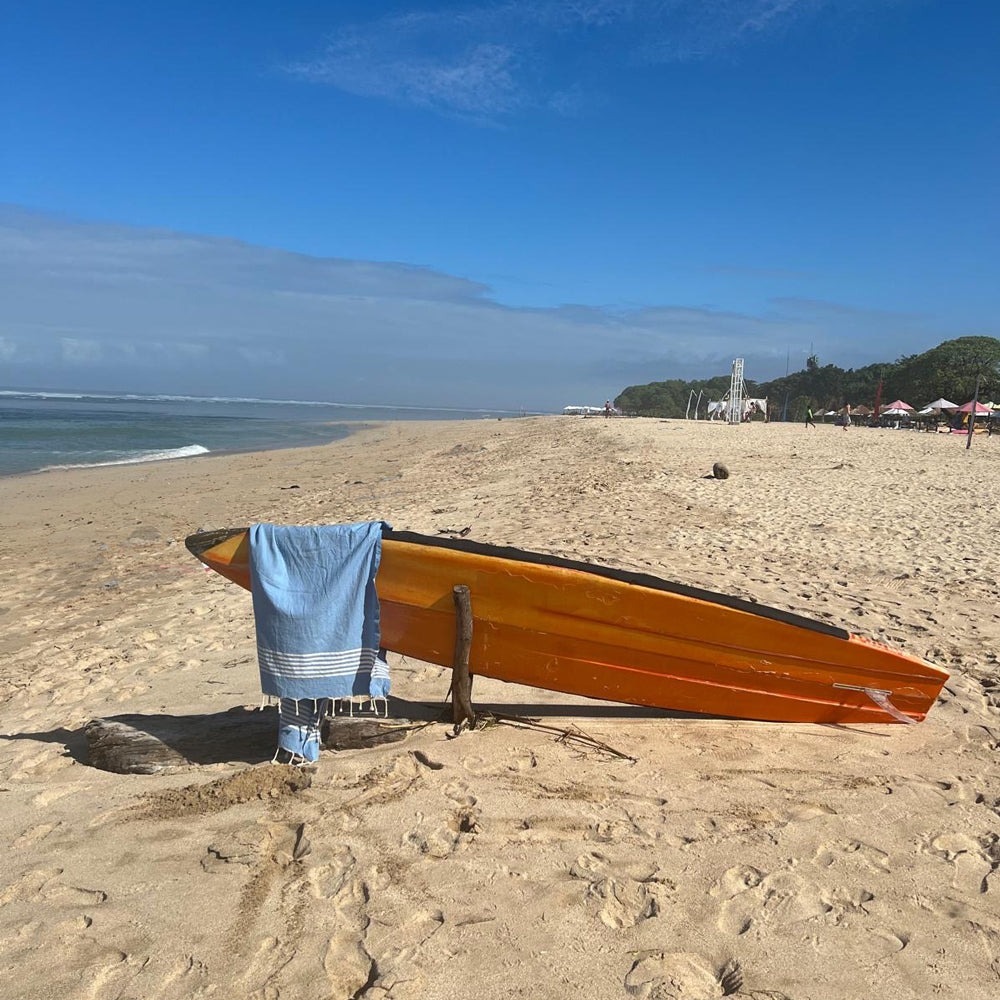 Grote zomers blauwe hamamdoek. Ideaal voor op reis. Compact in je koffer. Sla 'm om als een pareo. Droogt als een handdoek.
