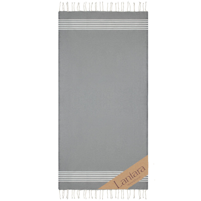 Gladgeweven hamamdoek. De doek heeft aan beide korte kanten 6 ingeweven streepjes en is afgewerkt met ecru kleurige handgevlochten franjes.