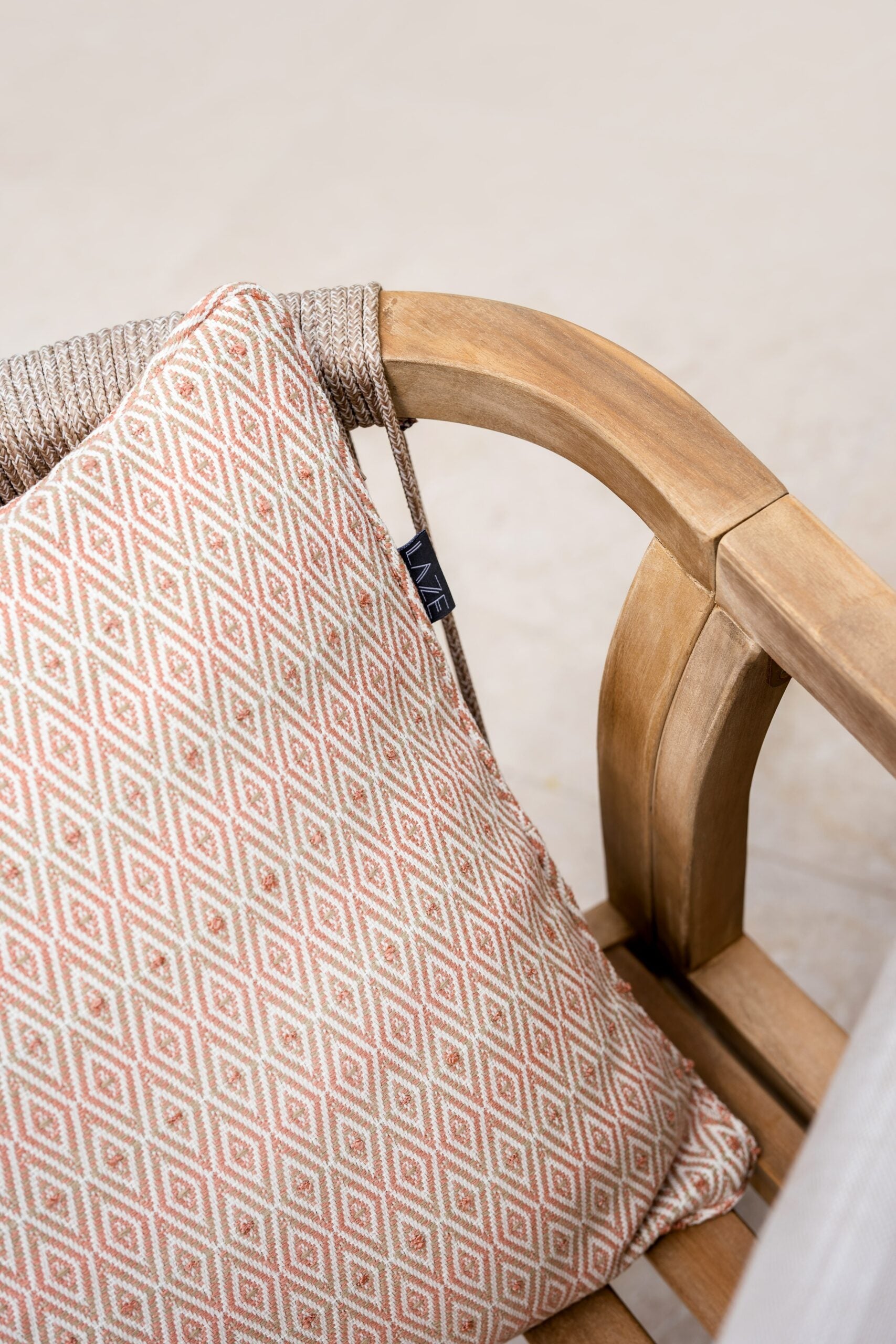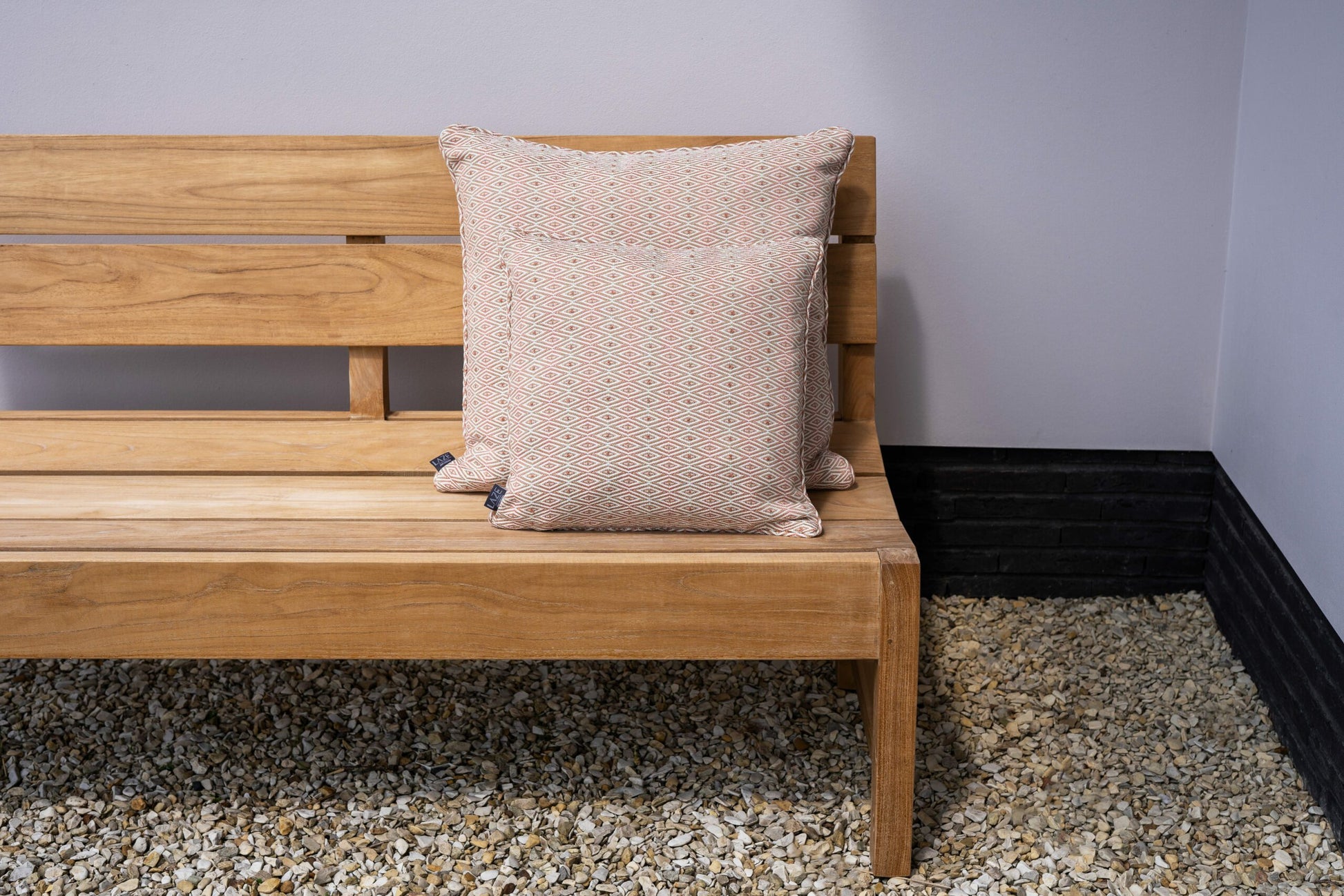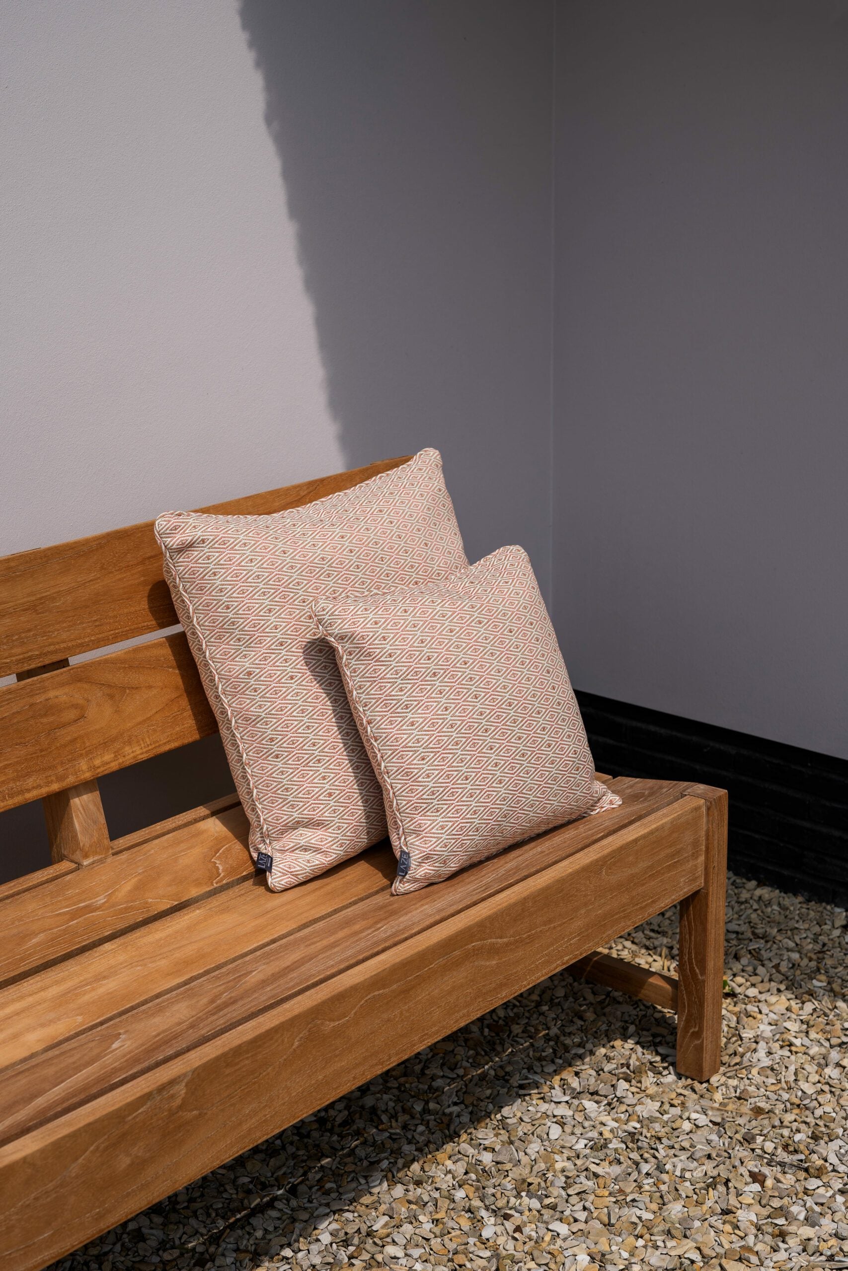Deze handgemaakte roze 'Diamond' sierkussens zijn superdeluxe afgewerkt met een piping. Het prachtige diamant patroon verloopt subtiel van kleur, wat de kussens een spannend en eigentijds effect geeft. De zachte stof is jacquard geweven van gerecycled plastic garen, waardoor het makkelijke eigenschappen heeft: waterbestendig, UV bestendig en vlekbestendig. De kussens zijn voorzien van een rits, zodat de hoezen op 30' gewassen worden. De binnenkussens zijn waterproof en gevuld met weersbestendig materiaal. Hierdoor drogen deze kussens snel, mochten ze door een buitje nat geworden zijn. Decoreer je tuin of balkon met deze prachtige kussens. En voor een complete look kun je zo ook combineren met de matching zitkussens en/of tafelkleden. Dus waar wacht je nog op? Verrijk je buitenleven met onze prachtige collectie duurzame zitkussens voor buiten. Geniet van comfort, stijl en de wetenschap dat je een positieve impact hebt op het milieu.