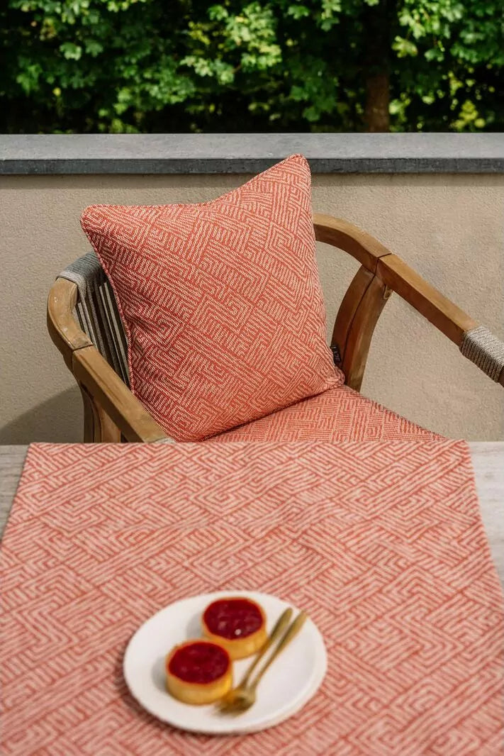 Deze handgemaakte ‘Maze’ sierkussens in prachtige koraal kleur zijn superdeluxe afgewerkt met een piping. Het subtiele, moderne patroon, geeft het kussen een spannend en eigentijds effect. De zachte stof is jacquard geweven van gerecycled plastic garen, waardoor het makkelijke eigenschappen heeft: waterbestendig, UV bestendig en vlekbestendig. Het kussen is voorzien van een rits, waardoor de afneembare hoes makkelijk gewassen kan worden. Het binnenkussen is waterproof, waardoor het kussen weer snel opdroogt als het door een regenbui nat geworden is. Voor een complete look kun je dit sierkussen combineren met matching zitkussens en/of tafelkleden.