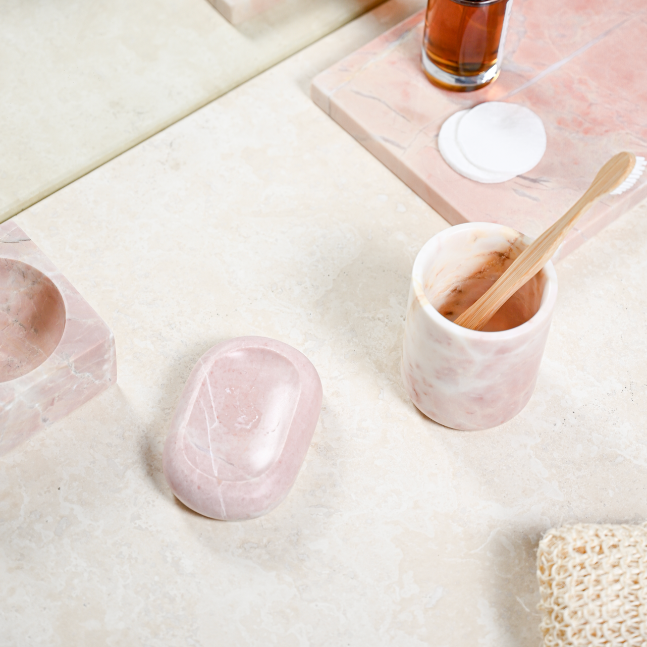 Rest your bar of soap in style with our Pink Marble Soap Dish. Crafted from premium pink marble, this elegant dish adds a sophisticated touch to your bathroom décor. The unique veining and natural beauty of the stone bring a timeless charm, while keeping your soap organized and dry.