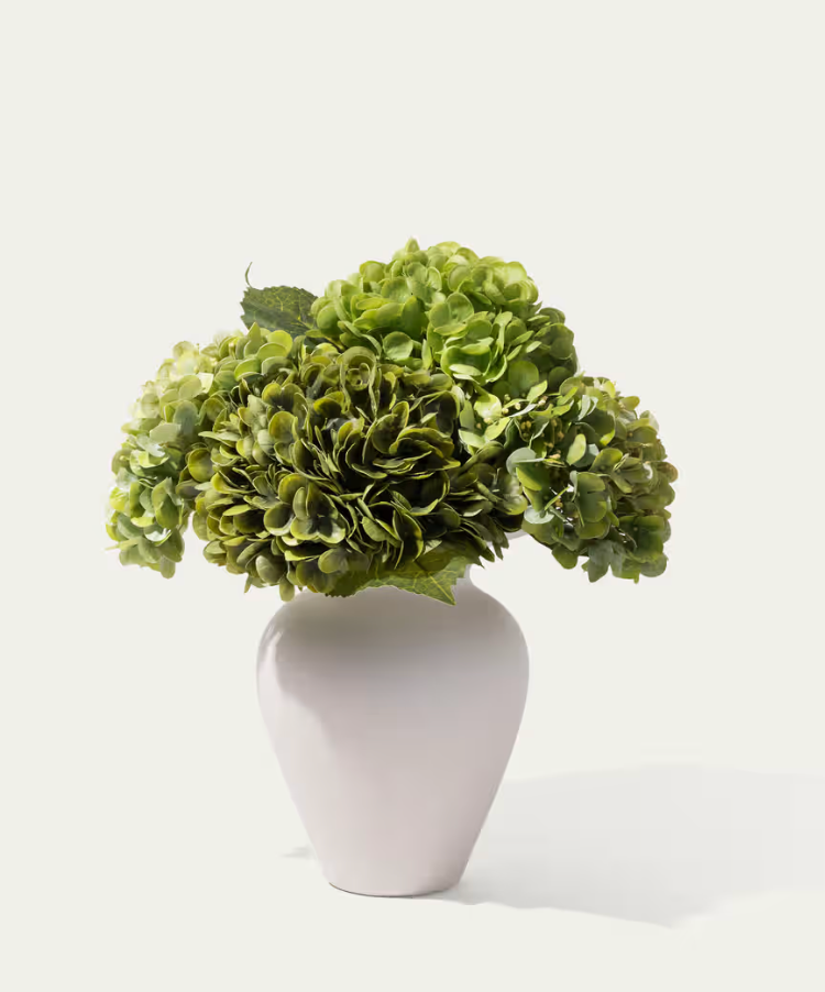 Organisch crèmekleurig vaasje met real-touch zijden hortensia’s in drie prachtige groentinten.
